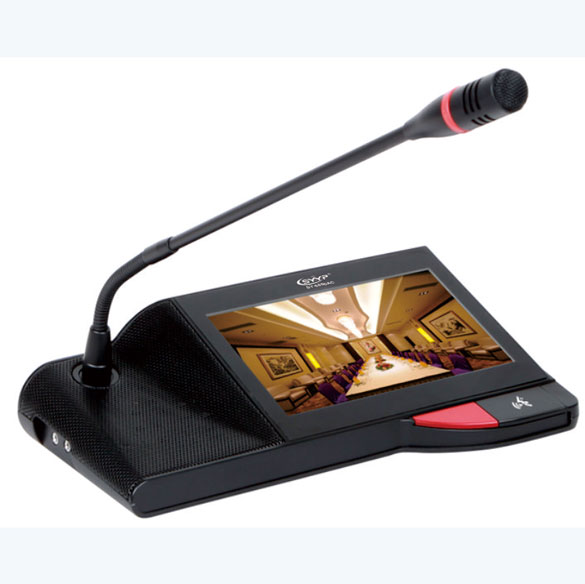 ■要發言時,按一下MIC ON/OFF鍵,此時燈環燈亮起;發言完畢, 再按一下MIC ON/OFF鍵,此時燈環燈滅。 ■所有發言設備都可通過系統設置菜單:調節本機的音量、LCD亮度。 ■麥克風具有發言開關可控制發言狀態。使用FPGA作為核心CPU。 ■具有強制切斷列席麥克風發言的優先功能,具有攝像機自動跟蹤功能。 ■臺面可移動式、可拔插咪管。 限制發言數量可選。 ■單元由系統主機供電。輸入電壓為DC24V,屬于安全范圍。 ■麥克風網頭具有環形紅色光環,可顯示麥克風發言狀態。 ■單元具有8P-DIN插座用于系統連接。 ■內置高保真揚聲器及外接耳機插孔。 ■可繞式電容麥克風,并配可更換式防風罩。 ■采用全新數控化設計。 ■可以發言與聆聽。 ■話筒桿具有加長型可供選擇。 ■麥克風具有發言開可控制發言狀態。 ■頻率響應: 80Hz~16kHz ■ 靈敏度: -44dB±2dB ■ 參考講話距離: 15cm~50cm ■咪桿長度: 390mm ■ 顯示屏:7” TFT 16:9 ■ 分辨率:800*480 ■色 彩:262K