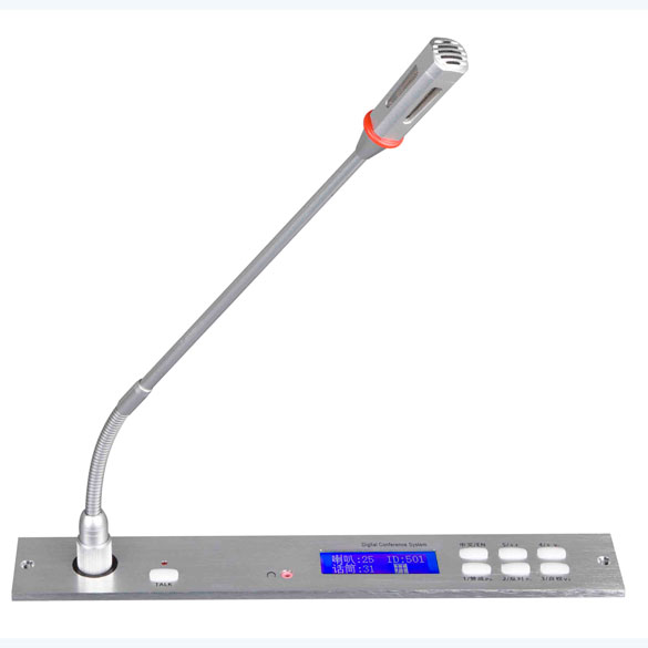 話筒音頭采用最新聲學研究成果,使用金屬鋁合金四方形結構;使得語音更加清晰厚實,頻響寬廣,靈敏度高不易產生嘯叫等特點。 嵌入式安裝會議話筒座,采用鋁合金拉絲工藝,分拆式設計 話筒具有6個輔助功能鍵和1個開啟/關閉鍵、 支持1鍵式語言切換,1鍵MUTE靜音和2鍵話筒音量、2鍵喇叭音量控制,按鍵都具有紅色指示發光,操作直觀,有效防止操作失誤 支持討論及視頻自動跟蹤功能 具有耳機監聽功能 具有LED液晶屏顯示并可切換中/英文操作界面