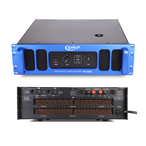 PH系列功放采用高檔鋁合金面板,電路采用先進的貼片技術,獨特的H類放大電路設計,工作效率高,機器更加穩定耐用。散熱風扇采用了智能無極變速電路,開機軟啟動,防浪涌設計,更好的保護了后級電路。內設壓限電路,對末端音箱起到了更好的保護作用。完善的保護電路,過熱保護、短路保護、直流保護、射頻干擾濾波保護。本機適用于流動演出、高級會所、電影院及多功能廳等場所。技術指標: 輸出功率/POREA 8Ω 800×2 1000W×2 1200×2 1400×2 輸出功率/POREA 4Ω 1200W×2 1600W×2 1900W×2 2200W×2 信噪比:>102dB 輸入阻抗:平衡20KΩ / 非平衡10KΩ 輸入靈敏度:0db/1V 頻率響應:20Hz~20KHz ±0.15dB 轉換速率:50V/us 通道隔離:105dB (1KHz) ;80dB (20KHz) 阻尼系數:8Ω/1KHz﹥450 連接器:輸入:XLR公母座;輸出:接線柱和Speakon座 交流輸入電壓:AC220-250V/50~60Hz" 3U外型尺寸:485x540x132mm 3U外型尺寸:640x590x180mm