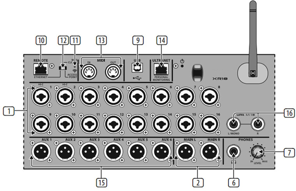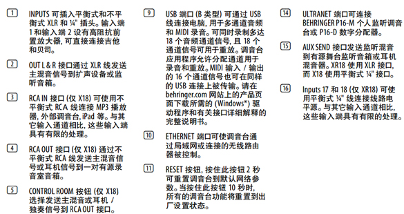 ■革命性的XR18擁有18路輸入和12路混音母線,我們將XR18的一切零部件集中安置在一個便攜式的堅固機架里面,只需使用iPad和Android平板電腦就能控制它。XR18非常適合于現場擴聲和錄音工作室,它擁有16個MIDAS設計的頂級麥克風前置放大器,內置了無線路由模塊用于無線遙控,此外我們還為XR18配置了一張雙向傳輸的USB音頻接口。 ■18路,12母線數字處理器,針對IPAD和安卓平板設計。配有16個可編程MIDAS前置放大器,內置wifi模塊和多通道USB音頻接口。您只需在iOS,Android和PC端裝上應用程序就可以在錄音棚或者會場里面自由移動和控制所有的參數,自由的混音。它幾乎適用于任何擴聲場合。無論是MIDAS前置放大器,自動混音功能,還是免費的多軌錄音,都讓這張調音臺顯得價值千金。專業音頻設備的發展,應該盡可能的讓操作變得簡單,“傻瓜式”,這樣可以讓用戶獲得最舒暢的體驗和服務。 ■內置三種模式的無線路由器:為了達到最佳的流動性,我們為XR18內嵌了一個集成的無線路由模塊。通過這個模塊,你可以直接無線遙控調音臺,無需另外配置和安裝一個外部路由器。XR18在混音上面給你更多的自由,你可以移動到擴聲區域的每個角落去聆聽現場的聲音。此外,你可以站在藝術家的角度去修飾現場的舞臺監聽,更妙的是,你還可以讓藝術家們通過自己的移動終端混合自己的無線監聽或者監聽音箱。 1.訪問點接入是連接4種控制終端最簡單的方法(iPad、安卓手機,平板電腦、筆記本電腦)這種模式需先開啟你的無線控制終端,并讓 它運行最少一分鐘以上; 2.無線連接端允許你的處理器與在同一網絡的其他無線控制終端連接在一起; 3.此外,你還可以直接通過網線連接到你的電腦,或者連接一個專用的無線路由器,讓無線頻帶更寬,距離更遠。 ■錄音更簡單:XR18標配了超低延時的18x18雙向多通道USB音頻接口,使之成為無比強大的數字混音和數字錄音調音臺。當輸送16路話筒信號和鍵盤手的MIDI信號進數字音頻工作站時,你可以通過電平表監視各路的信號,將它們完美的混合在一起,所有的操作近乎零延時。那些在錄音棚、排練室、舞臺上的搖滾歲月,你可曾想把它們記錄下來?有了XR18,這一切將可變成無比清晰的記憶! ■革命性的自動混音技術:在一些特定的場合,如座談會、新聞發布會或者法庭的審訊,往往需要同時使用多個話筒,并且保持主席話筒的優先地位,作為此款處理器的革新技術之一,X AIR 的增益共享技術能管理多達16個話筒。采用Dan Dugan自動混音系統,XR18 的增益共享技術能實時自動調控所有連接話筒的電平,無須任何額外的操作。 ■Xr18實現自動混音:以往同時使用2個或以上話筒時,反饋噪聲、錄音噪聲和濾波器噪音問題使人備受困擾,而XR18增益共享技術則能使你從此遠離這些煩惱。此技術為系統增益結構持續護航,,即使多人同時使用話筒講話,也能使系統處于平穩狀態。4個機載X32效果器